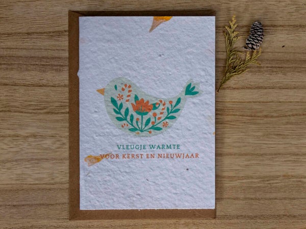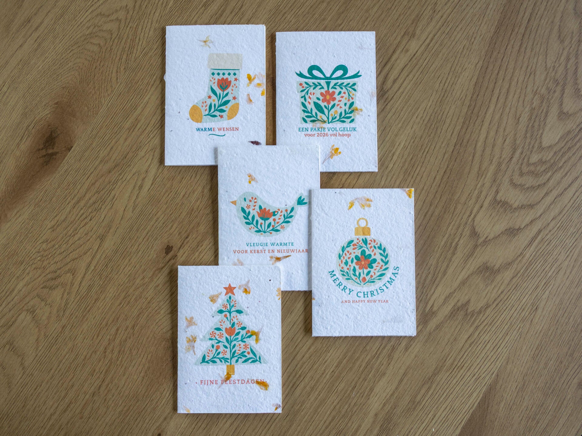 Deze set van 5 kerstkaarten op handgeschept bloeipapier is perfect om een lieve wens te delen én de natuur iets terug te geven. 🌸